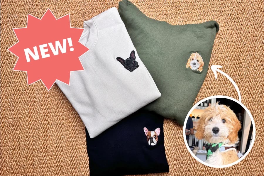 La foto de su mascota se convierte en un retrato ilustrado de su mascota, que luego cosimos de manera personalizada en la prenda de vestir que elija.