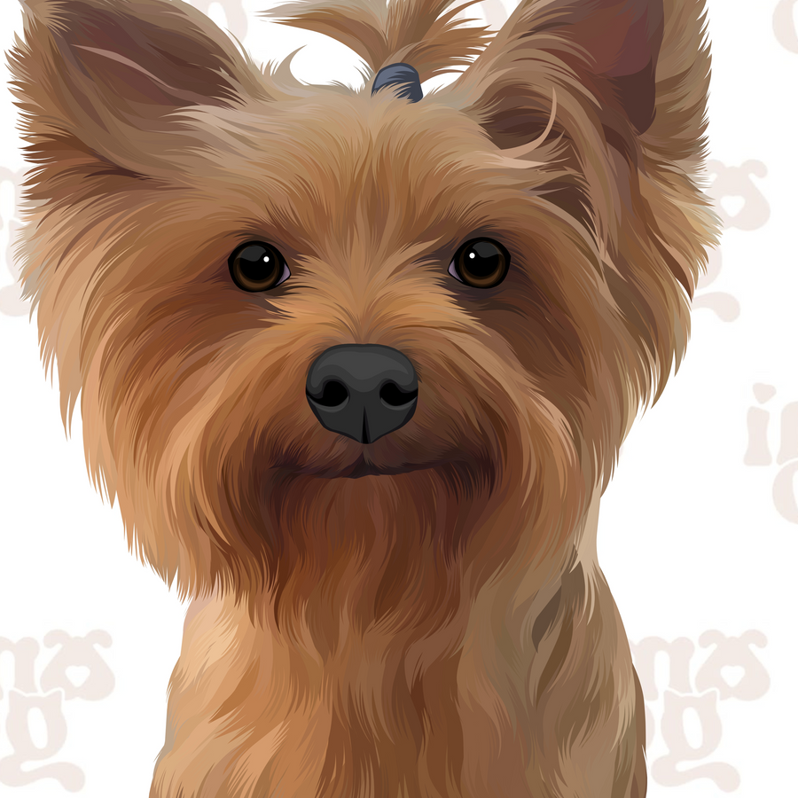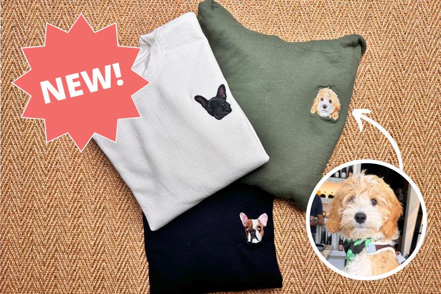 La foto de su mascota se convierte en un retrato ilustrado de su mascota, que luego cosimos de manera personalizada en la prenda de vestir que elija.
