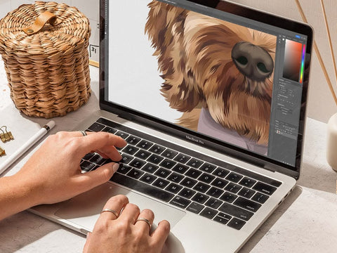 Los retratos de mascotas de Amigo Vector están ilustrados a mano por nuestro talentoso artista digital. Cada retrato se crea mediante un proceso de diseño manual y altamente técnico. No usamos filtros ni aplicaciones.
